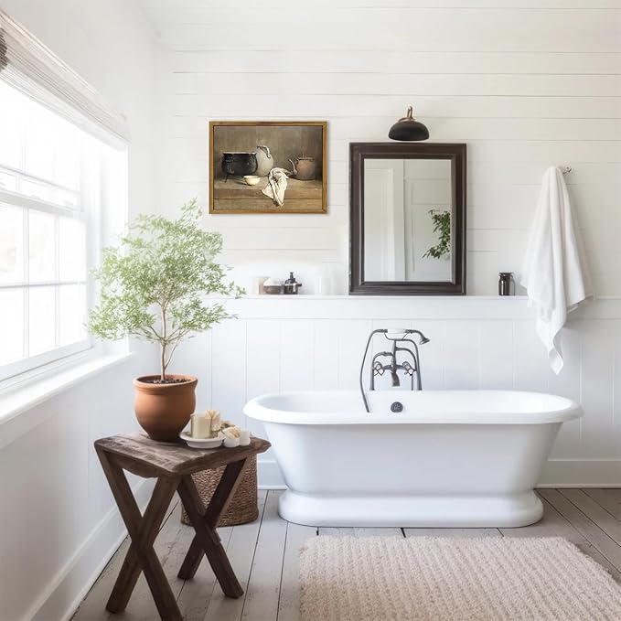 - 【Premium Materials】 Immerse yourself in the superior craftsmanship of this high-quality canvas wall art prints. Printed on premium canvas and using the finest fade-resistant ink with a waterproof film on it to ensure the colors stay vibrant and lasting. And each vintage bathroom pictures is stretched tightly over a wooden frame, ensuring the canvas is stretched and does not buckle. We insist on using the best materials and workmanship to ensure its durability.