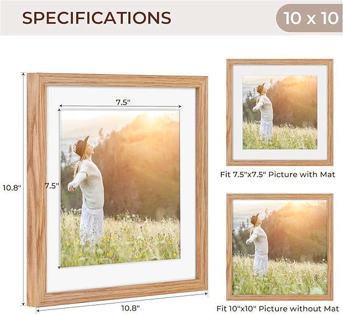 - NATURAL SOLID WHITE OAK WOOD FRAME - This 10x10 picture frame is made of high-quality 100% solid white oak wood, the natural wood grains on this real oak wood picture frame lends it an authentic look. This poster frame comes with 1.2mm ivory mat for visualization purposes, and 10x10 picture frame can be matted to 8x8.
