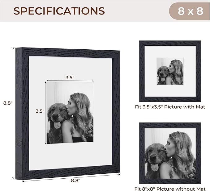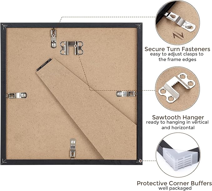 - WELL PACKAGED - Each 8"x8" square frame is shrink-wrapped and secured with corner protectors, all of our 8 x 8 wood frames are packaged in custom-made corrugated boxes so your frames arrive in pristine condition.