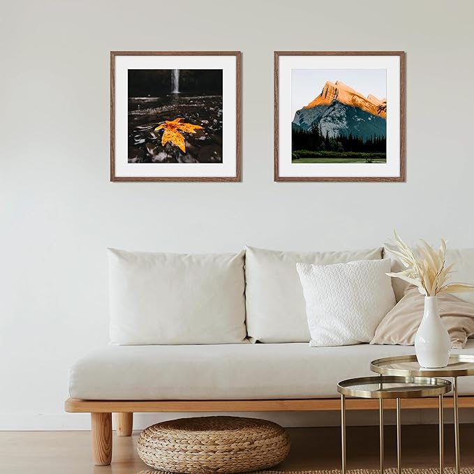 16x16 Picture Frames, Solid Oak Wood Photo Frame 16 by 16, Rustic Wooden Square Picture Frame with Tempered Real Glass, 16 x 16 Square Frame Matted to 12 x 12, Walnut Color, Set of 2