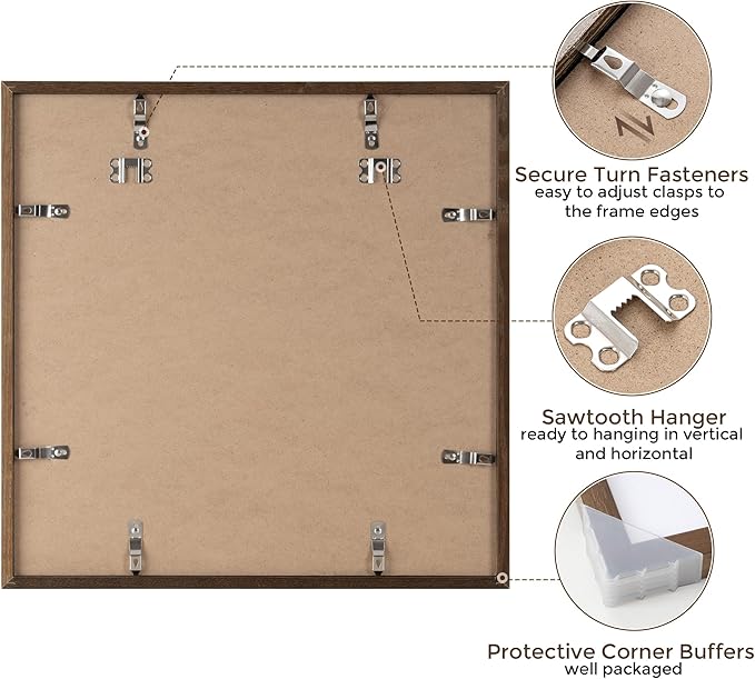 - WELL PACKAGED - Each 16"x16" square frame is shrink-wrapped and secured with corner protectors, all of our 16 x 16 wood frames are packaged in custom-made corrugated boxes so your frames arrive in pristine condition.