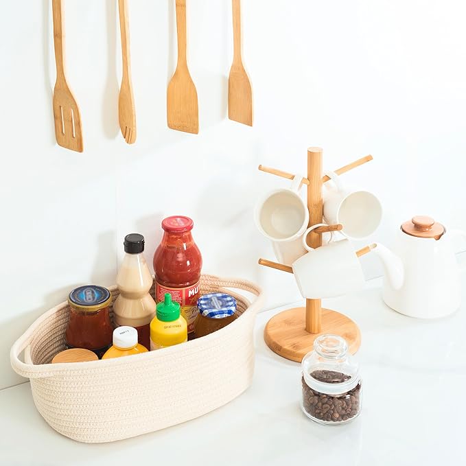 - Designed to Complement Any Décor - Enhance your table and countertop displays with our stylish and practical basket set. Not only will these baskets aid in organization, but their sleek and sophisticated design, coupled with a neutral color palette, effortlessly complements any decor style, be it boho, rustic, farmhouse, modern, or classic. Whether placed on a nightstand, bedside table, coffee table, pantry, walk-in closet, shelves, kitchen countertop, or bathroom vanity top, these baskets add character to your rooms while maintaining tidiness.