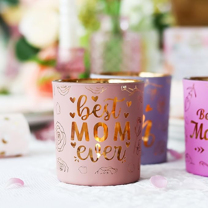 - Elegant Mother's Day Gifts: Celebrate Mothers Day with this stunning set of 4 votive candle holders, each engraved with heartwarming messages including "Thank You Mom," "Best Mom Ever," "My Beloved Mother," and "Love U Mom." The delicate combination of pink and white colors adds a touch of elegance to any setting