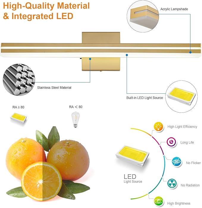 - 【Material】Metal Gold Frame with advanced electroplate craft and sealing technology, dust-proof, fog-proof, anti-corrosion and moisture-proof, suitable for humid environment. Frosted White Solid Acrylic Lampshade is rugged, durable and unbreakable, provides excellent down lighting without glare. Gives a great contemporary look to your master bathroom.