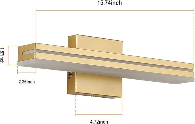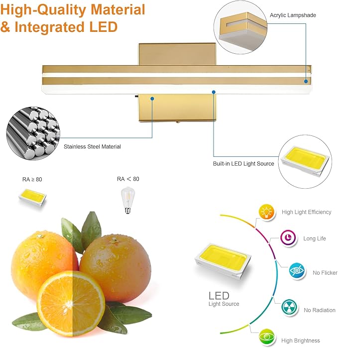 - 【Material】Metal Gold Frame with advanced electroplate craft and sealing technology, dust-proof, fog-proof, anti-corrosion and moisture-proof, suitable for humid environment. Frosted White Solid Acrylic Lampshade is rugged, durable and unbreakable, provides excellent down lighting without glare. Gives a great contemporary look to your master bathroom.