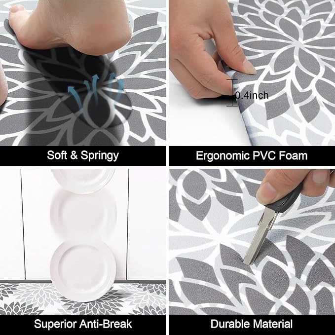 - Cushioned Comfort & Anti Fatigue Kitchen Floor Mats Set of 2: Designed with 0.4inch thick cushioned rebound foaming PVC materials, these 2 pieces kitchen mat and runner help reduce fatigue and discomfort, providing exceptional support for your feet, legs, and back during long hours of standing while cooking or washing dishes