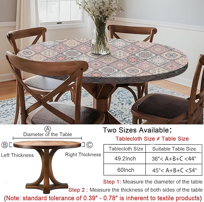 - 【High-quality Material】Our indoor and outdoor round tablecloth is made of durable high-quality material, ensuring long-lasting use and excellent performance. Carefully designed, allowing you to use it with confidence without worrying about quality issues. Suitable for 45-54 inch round tables, please measure your table size carefully before purchasing.(Note:standard tolerance of 0.39" - 0.78" is inherent to textile products.)
