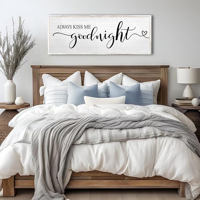 Always Kiss Me Goodnight Wall Sign 40''×15'' Vintage Master Bedroom Above Bed Farmhouse Wooden Framed Family Wall Decor for Larg Couples Over Bed Wall Art Decoration (White)