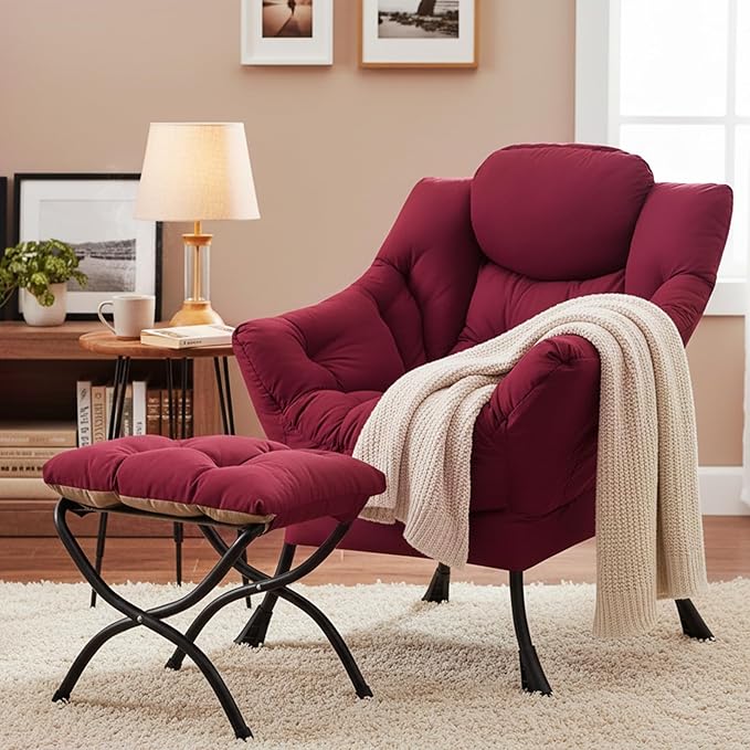 Lazy Chair with Ottoman, Modern Chair with Folding Footrest, Lounge Accent Chair, Comfortable Reading Chair (Burgundy)