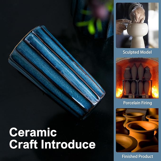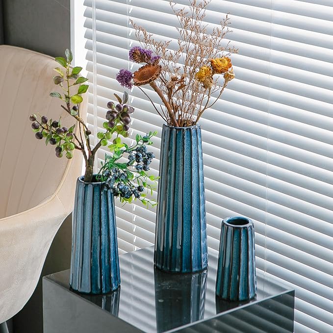 - Modern Minimalist Home Decor with Versatile Sizes: The Mowtanco Blue Ceramic Vases are the perfect addition to modern minimalist home decor. Their sleek blue ceramic design and ribbed texture create a contemporary aesthetic that complements various interior styles. With three sizes available—small (2.75 x 2.75 x 5 in), medium (3.25 x 3.25 x 7.5 in), and large (3.75 x 3.75 x 10.25 in)—these vases offer flexibility in arranging and styling, allowing you to create a personalized look that suits your space.