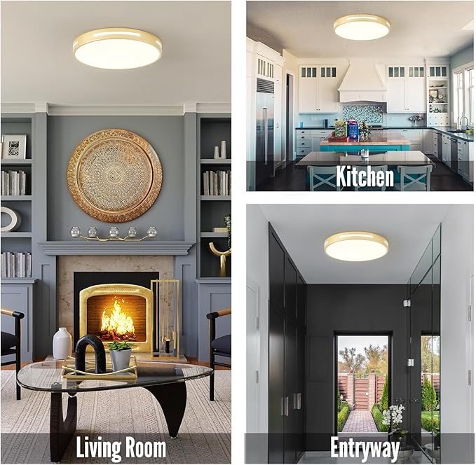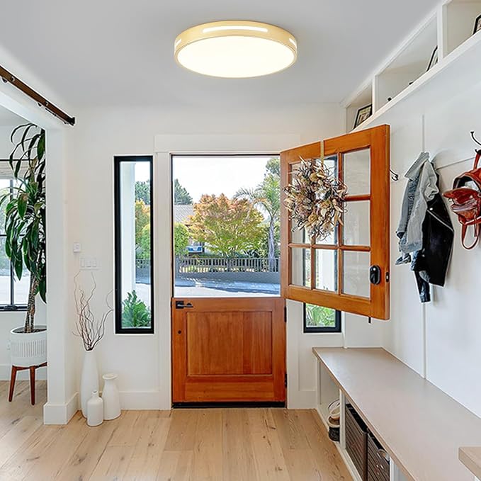 - ๐ใWheatronic15 Inch 36W Round Bedroom Lights for Ceiling Overhead 2 PackใThis LED flush mount light fixture Ceiling Mount features an integrated LED panel, with a power consumption of only 36W (equivalent to 120W), it delivers a bright output of up to 3600 Lumens. The 15 inch LED gold drum ceiling light flush mount to traditional bathroom ceiling light not only provides even and brilliant illumination but also helps you save significantly on electricity bills of the modern ceiling light. Moreover, this hallway lighting fixtures ceiling offers a flicker-free, non-glare, and non-buzzing lighting experience, ensuring optimal eye comfort and reducing eye fatigue for your family.