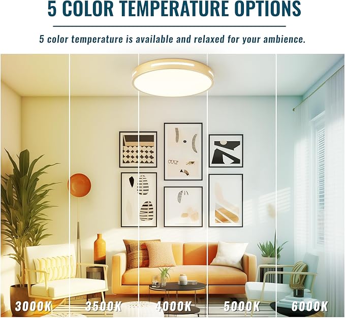 - ๐ใ3000K/3500K/4000K/5000K/6000K Five Color Temperature & Stepless Dimmingใ Wheatronic bedroom ceiling light set of 2 offers five selectable color temperatures: 3000K (Warm White), 4000K (Neutral White), and 5000K (Daylight White)for different rooms including bedroom, bathroom, kitchen, living room, restroom, laundry room, washrooms, closets, hallway, stairway, dining room, workshop garage, nursery room, kidsโ room. Additionally, this LED round close to ceiling light fixtures can be easily dimmed from 10% to 100% with a compatible dimmer (not included) to create the perfect ambiance for any occasion.