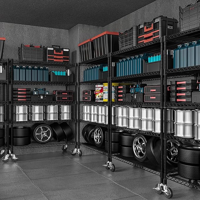 - HEAVY DUTY STORAGE SHELF: Our storage shelf is made of sturdy carbon steel and 25.4mm metal rods and each shelving unit holds up to 440 LBs on leveling feet, with a total bearing capacity of 1760/2200LBs (Approximately 530 LBs on wheels.)