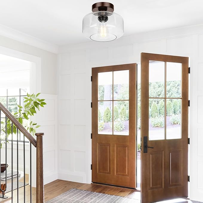 Industrial Semi Flush Mount Ceiling Light Brown, 800 Lumen LED Bulb Included, Clear Glass Shade Ceiling Light Fixture, Light Fixture for Hallway Bathroom Bedroom, Vintage Hanging Light Fixtures