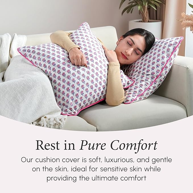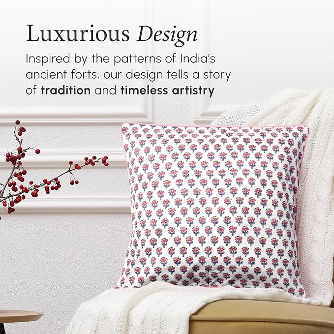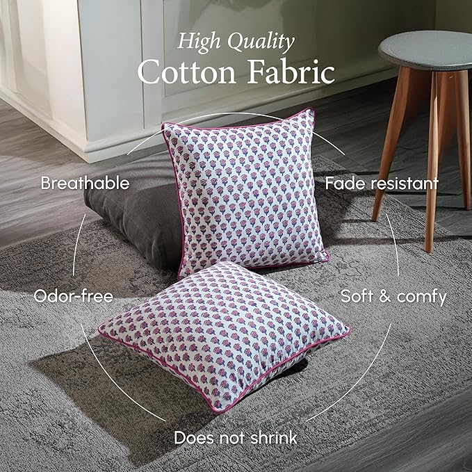 CPC 100% Cotton Throw Pillow Covers 18x18 Inch, Set of 2 Pink Block Print Pattern Couch Pillow, Cute Boho Decorative Pillows for Living Room, Bedroom with Hidden Zipper- Pink Sapphire