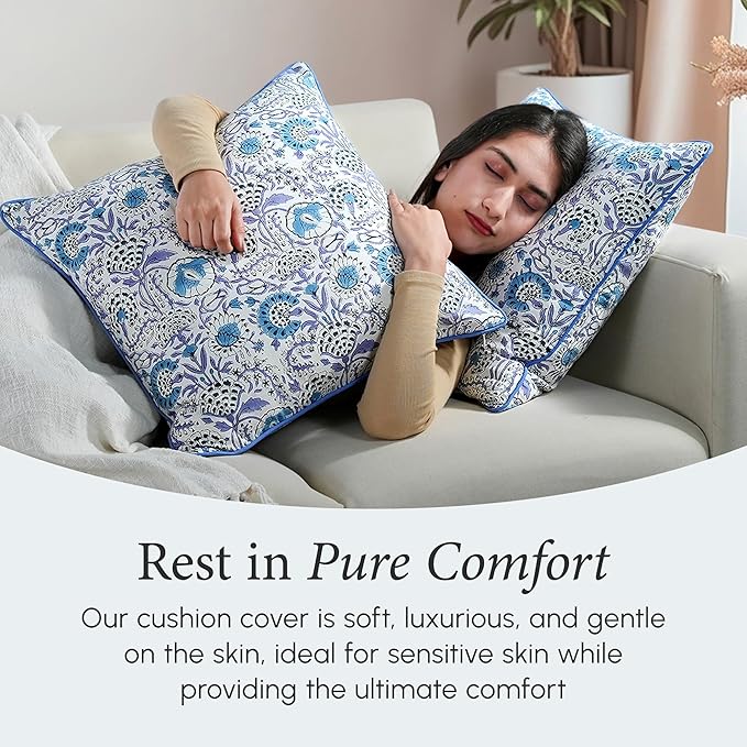 CPC 100% Cotton Throw Pillow Covers 18x18 Inch, Set of 2 Blue Block Print Pattern Couch Pillow, Cute Boho Decorative Pillows for Living Room, Bedroom with Hidden Zipper- Indigo Blue