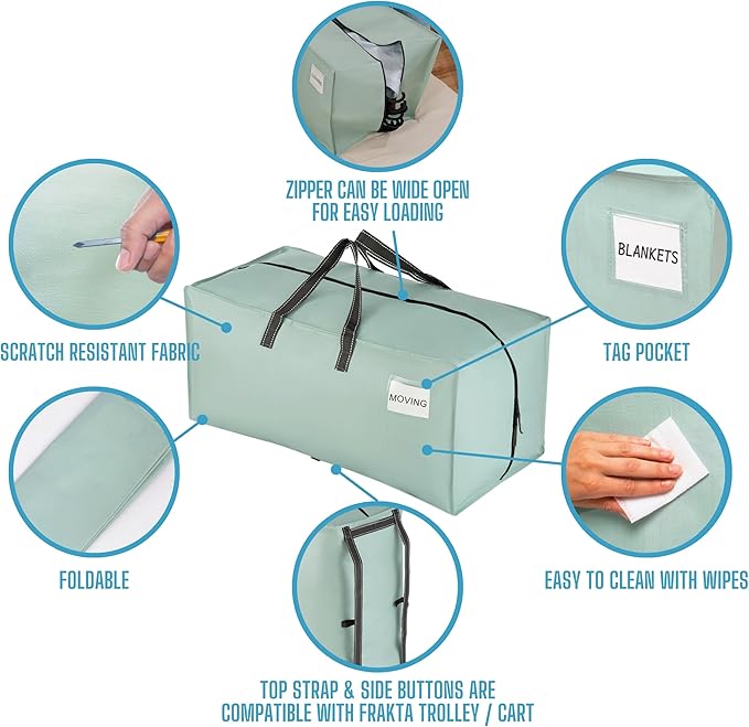 VENO 4 Pack Moving Bags w/Backpack Straps, Heavy Duty, Moving Boxes Alternative, Packing Supplies, Large Storage Totes for Dorm Room Essentials with Zipper for Clothes (Light Green Matte, 4 Pack)