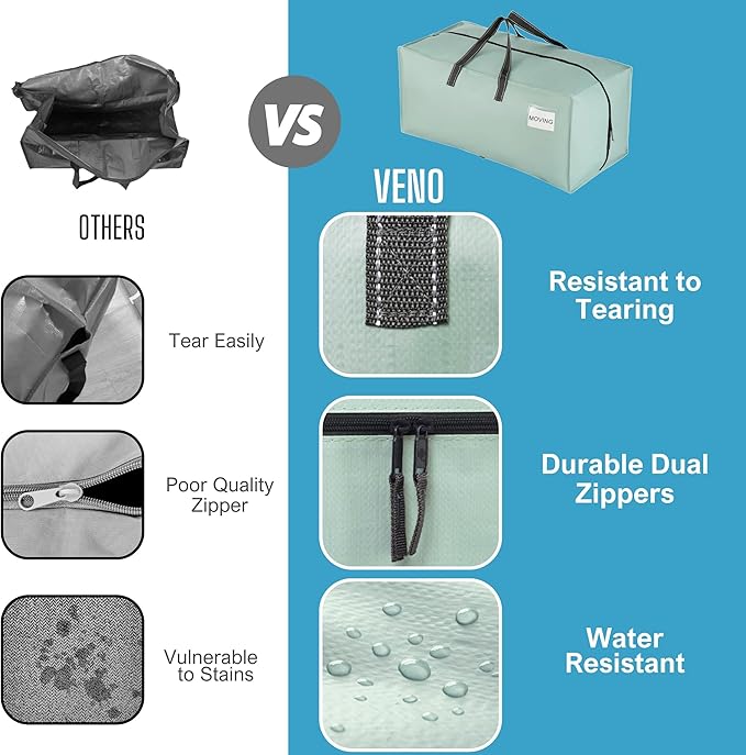 - Hassle-Free Move without Boxes – No need to buy or assemble packing boxes or look for moving supplies. Streamline your move with VENO strong and spacious heavy duty moving bags that make a lightweight, convenient, and economical alternative to moving boxes. Just unfold, unzip, and begin loading to move your essentials into your college dorm room or new home! Use a wipe or damp cloth to clean & followed by air-drying. Collapse and fold flat to store in your drawers, cabinets, or shelves.