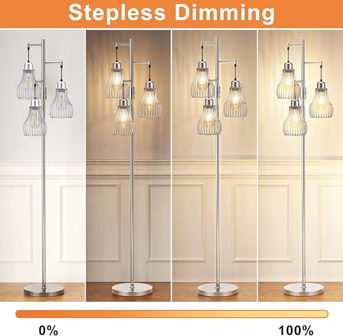 - 【Adjustable, Stepless Dimming(0-100%)】- Unlike other traditional non-dimming floor lamps, our dimmable floor lamp is completely stepless dimming. Silver floor lamp has a knob to adjust the brightness of the light rather than just turning on the lamp, having it be super bright lighting.The dimming feature is better than expected as tall floor lamp has certain settings so you can make it as dim or as bright if you want. And you will love the pattern the cage makes on the walls.