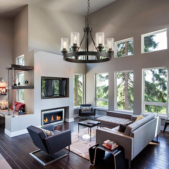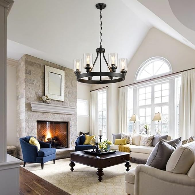 - 【Black Farmhouse Chandelier】 This black chandeliers for dining room is shaped a wagon-wheel inspired round frame in matte black finish and adopts 6 clear glass shade, creates a great mix of rustic farmhouse and contemporary industrial style, adds a vibrant ambience to your home.