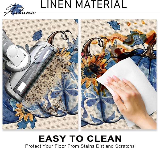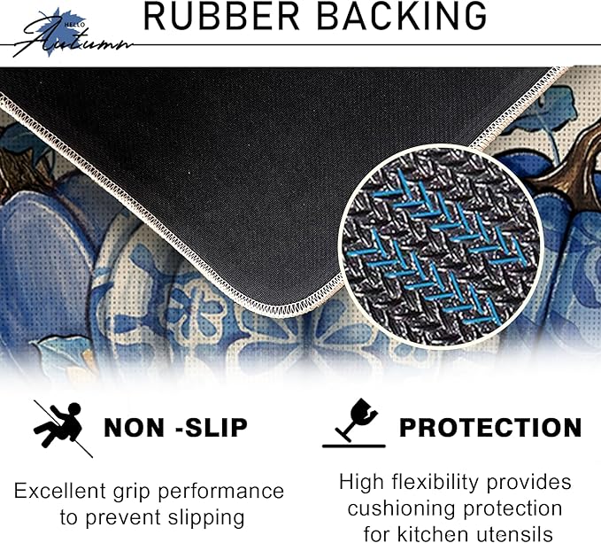 Fall Blue and White Porcelain Pumpkin Kitchen Rugs Set of 2, Autumn Sunflower Kitchen Mats Decor, Thanksgiving Seasonal Floor Door Mat Home Decorations - 17x29 and 17x47 Inch