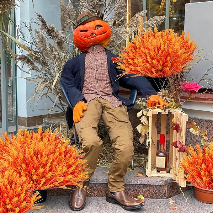 N&T NIETING 6 Bundles Artificial Fall Plants Outdoor Fake Monkey Grass with Lavenders Flowers for Pot Garden Verandah Decor for Thanksgiving Autumn Weddings Patio Hanging Planter Front Porch (Orange)