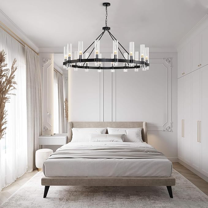 - 【Large Wagon Wheel Chandeliers】: Crafted of solid matte finish metal, unadorned metal bands hold the slender glass cylinders in place, in a state of perfect balance. With 16 lights providing 360°light coverage, within each, bulbs will glow like flickering candles, makes it a distinctive and eye-catching complement for any home. It is a versatile and attractive option for any space you want to add modern trendy and luxury charm, from traditional, industrial to contemporary.