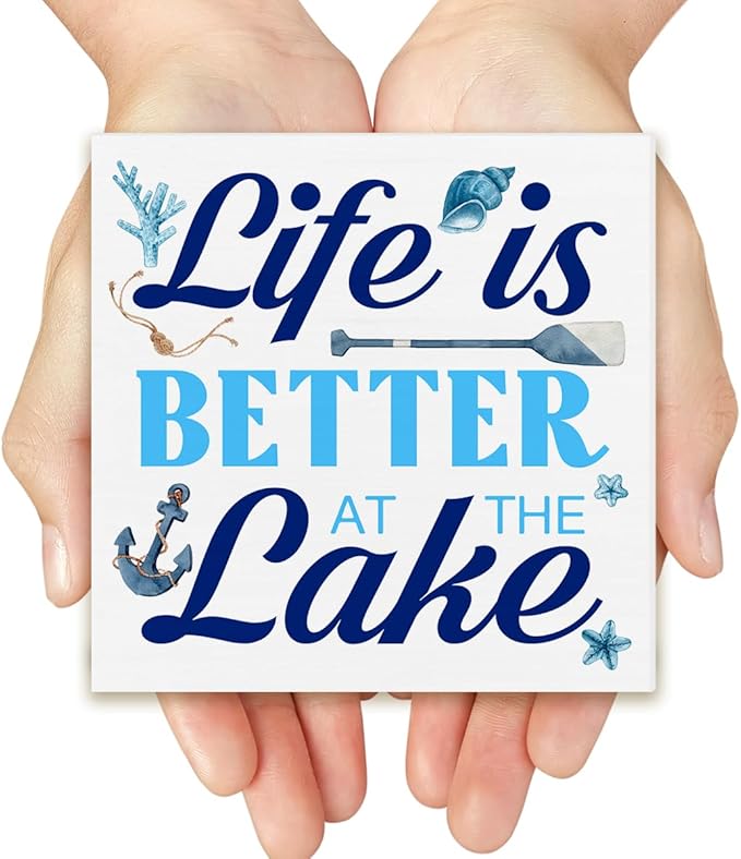 Summer Lake Decor Lake House Wood Block Sign Summer Decorations for Home Desk Table Shelf 5 x 5 Inches