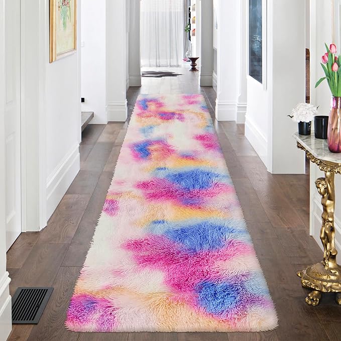 Fluffy Colorful Rug for Bedroom 2x8 ft Kawaii Tie-Dyed Area Rug Non Slip Cute Unicorn Kids Runner Rug for Girls Princess Teens Living Room Playroom Baby Nursery Decor Carpets