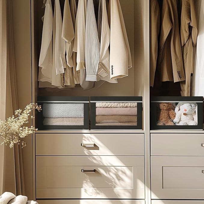 - [Practical Design] The front of the storage box has been chosen to be transparent, making it easy to identify the contents of the closet organizer at a glance. Meanwhile, the removable lid enhances the flexibility of using the decorative storage bins, when you are storing out-of-season clothes, the lid can keep the out-of-season clothes clean all the time.