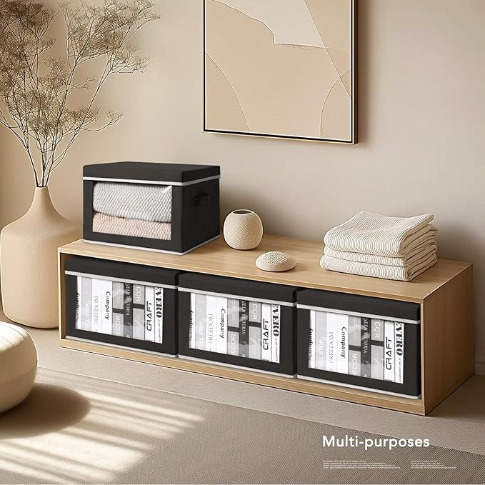 Storage Boxes with Lids - 5 Pack Foldable Clear Window Storage Bins, Large Decorative Storage Bins with Handles, Storage Containers for Clothes, Towel, Blanket, Sheet, Black