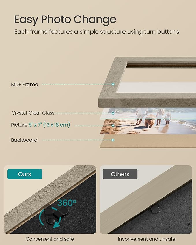 - [Change Pictures with Ease] With durable turn buttons on the back of each picture frame, you’ll be able to easily change your pictures every time you want to revisit your favorite family memories