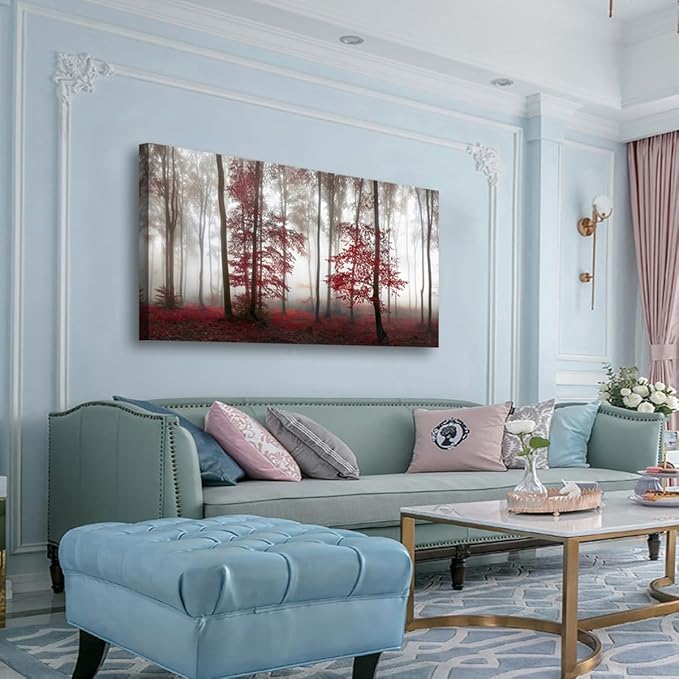 Misty Forest Pictures Canvas Wall Art for Living room Office Bedroom Wall Decor,Forest Wall Art Print Paintings Modern Nature Red Tree Artwork Waterproof Ready to Hang-24x48 inch