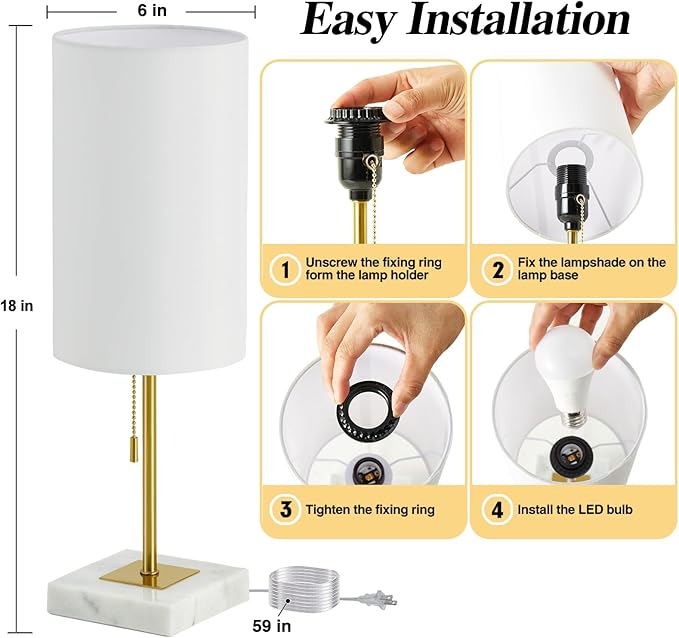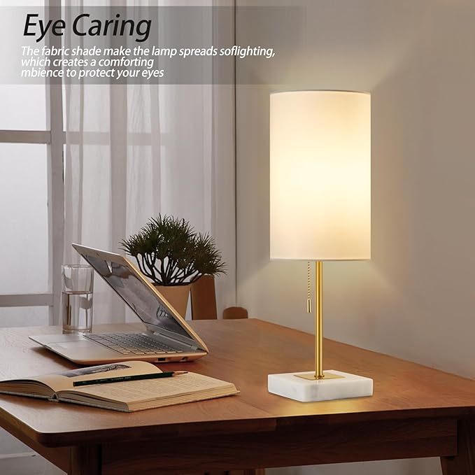 - 【Reading Lamp with Square Marble Base & Eye Caring Shade】 The night lamp with high quality Marble + Metal base which have upgraded finish is anti-rust and corrosion free. The heavy base can prevent it from tipping or wobbling and the thick pole design will hold the lamp shade steadily, no shaking. Besides, the fabric shade make the lamp spreads relaxing, comfortable, evenly and soft lighting, which creates a comforting ambience to protect your eyes.
