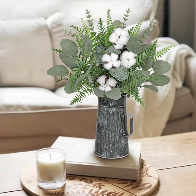 - Natural Design & Premium Material: This artificial eucalyptus and fern leaves with stems in vintage metal vase are made from premium quality silk and plastic, natural cotton flower bolls stem is added as an embellishment to create a natural atmosphere, perfect for table centerpieces, mantel displays or rustic wedding decorations