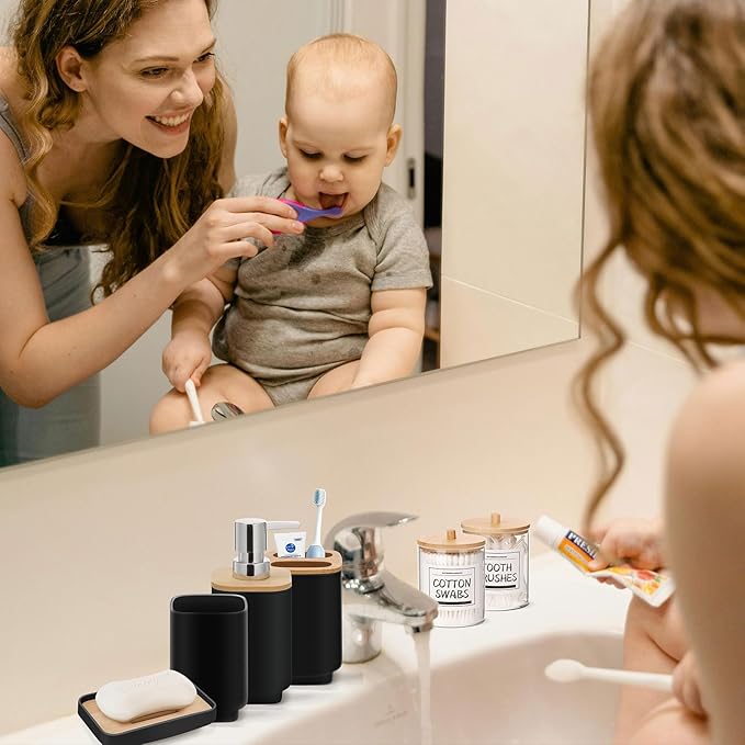 - Complete Bathroom Accessory Set:Featuring a Toothbrush Holder,Toothbrush Cup,Tray,Soap Dispenser,Soap Dish,Trash Can,Toilet Brush,4 Qtip Holders&Labels,our bathroom accessories set ensures a unified and stylish bathroom aesthetic.