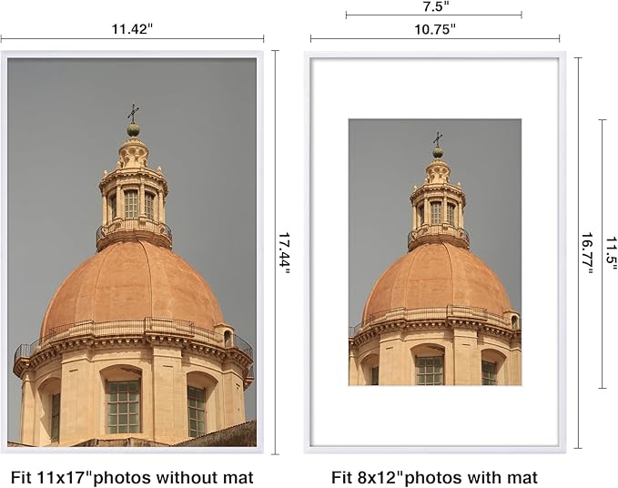 - Versatile Design: This white frame accommodates 8x12 photos with mat or 11x17 without mat. The mat is slightly reduced by 0.5 inches to keep photos in place. Suitable for both horizontal and vertical display, it complements various decor styles