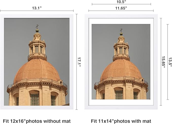 - Versatile Design: This white frame accommodates 11x14 photos with mat or 12x16 without mat. The mat is slightly reduced by 0.5 inches to keep photos in place. Suitable for both horizontal and vertical display, it complements various decor styles