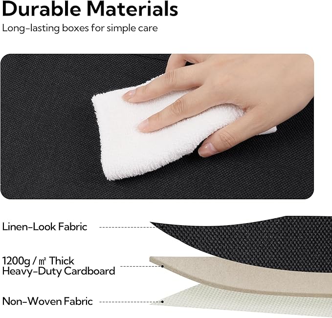 - Eco-Friendly Material - Made of textured linen-like fabric, breathable and wear-resistant, without irritating odor. Fabric boxes come in sets of 3, each measuring 14¼"L x 10"W x 8½"H.