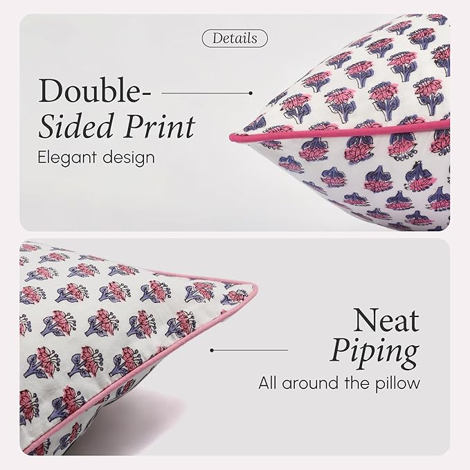 CPC 100% Cotton Throw Pillow Covers 24x24 Inch, Set of 2 Pink Block Print Pattern Couch Pillow, Cute Boho Decorative Pillows for Living Room, Bedroom with Hidden Zipper- Pink Sapphire