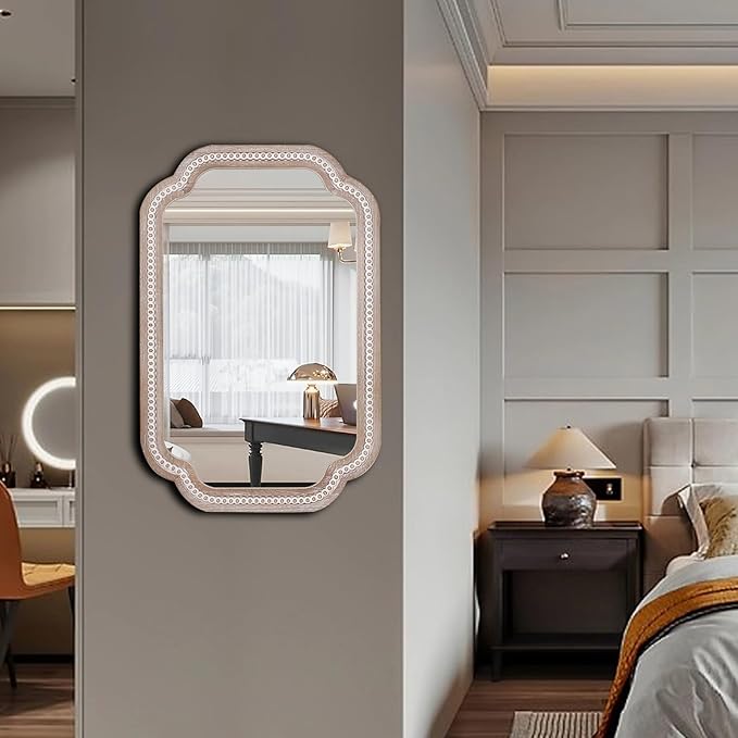 - Unmatched Elegance: Elevate your space with our exquisite bathroom mirror Scalloped wood frame, a stunning 36x24 inches in size. Imagine it gracing your entryway, reflecting natural light and welcoming guests with its unique design.