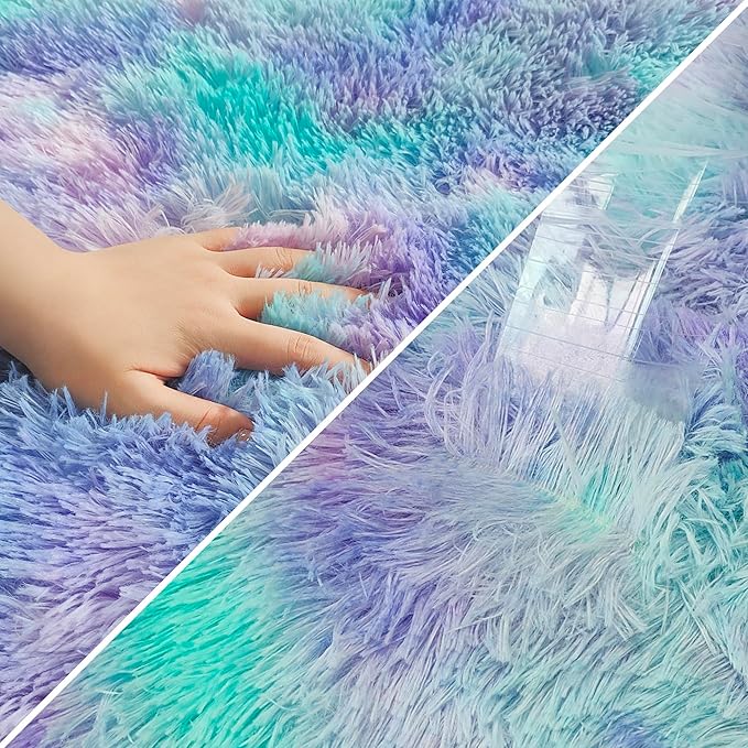 Super Soft Fluffy Living Room Area Rug 2x8 ft Purple Rainbow Tie-Dyed Shaggy Furry Carpet Washable Non-Slip Carpets Bedroom Bedside Nursery Rug Cute Colorful Room Decor for Girls