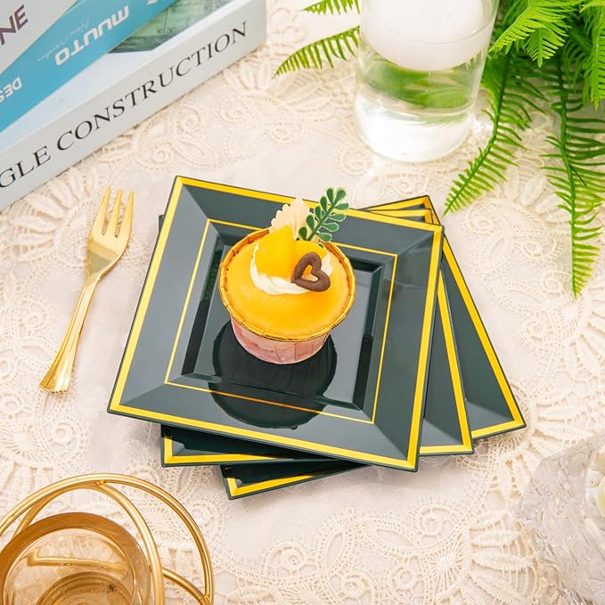 - ELEGANT TABLEWARE SET: Our 100-piece green and gold plastic plates includes 5-inch green plastic dessert plates disposable and matching 6-inch gold plastic forks, designed to elevate the style of your dining table with a modern and sophisticated look. Guests will marvel at the visual delight this beautiful cutlery set brings to any