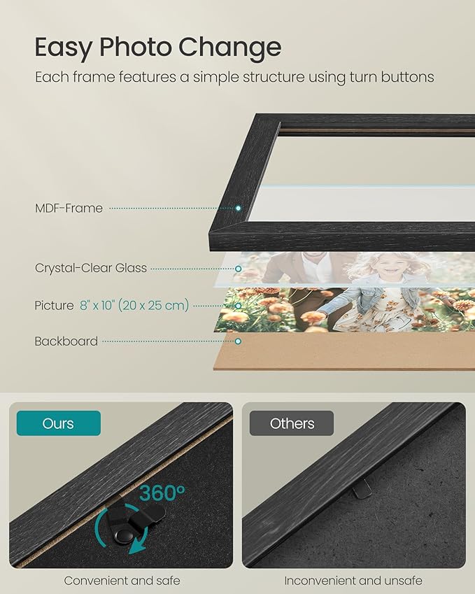 - [Change Pictures with Ease] With durable turn buttons on the back of each picture frame, you’ll be able to easily change your pictures every time you want to revisit your favorite family memories