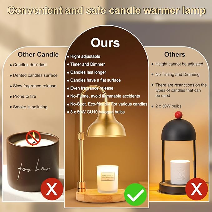 - 【Convenient Dimmable & Timer Function】You can control the melting speed by adjusting the brightness of the candle warmer to regulate the intensity of the scent. The brighter the setting, the faster it melts. In addition, you can also use the timer (2H/4H/8H) to automatically turn off the bulb after the desired time, ensuring safety, energy saving and prolonging bulb life. Creating the perfect ambiance for any occasion or mood, you can be assured of a relaxing and enjoyable scenting experience.