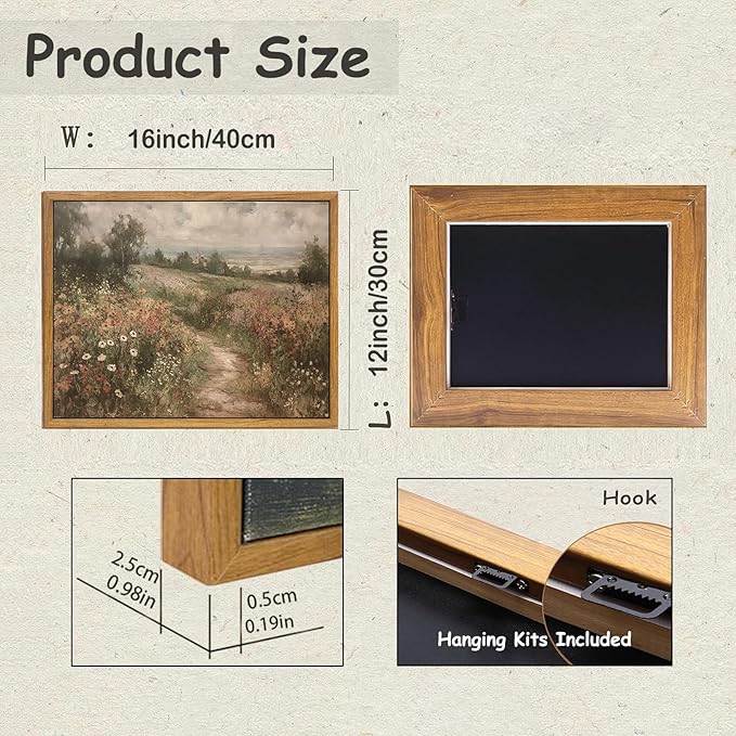 - 【Ready To Hang】Measuring 12x16Inch(30x40cm), this framed canvas art wall decor arrives ready to hang on the wall with hanging kits. (Before nailing the hook onto your wall, please refer to the installation instruction image provided. ) The vintage spring meadow landscape painting is the best choice for Housewarming parties or gallery decoration.