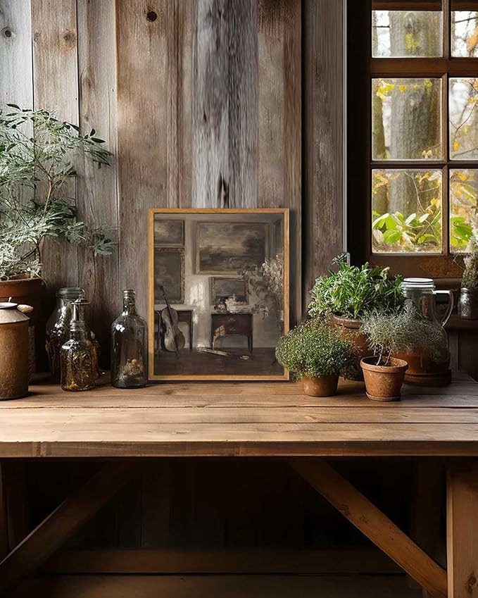 KBKBART Vintage Framed Wall Art, Farmhouse Decor Moody Still Life Canvas Oil Painting Vintage Dark Bathroom Art Prints, Neutral Antique Wall Art Decor for Bedroom, Living Room, Gallery, Gifts for Friends or Family (8"x10")