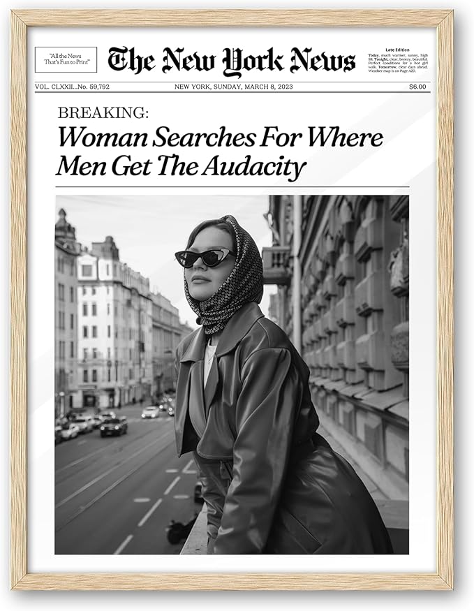 iHery Natural OAK Wood Newspaper Trendy Framed Wall Art, 12x16 in Vintage Headline Canvas Print, Woman Searches for Where Men Get The Audacity Poster, New York News Beige Frame Logs Retro Set of 1