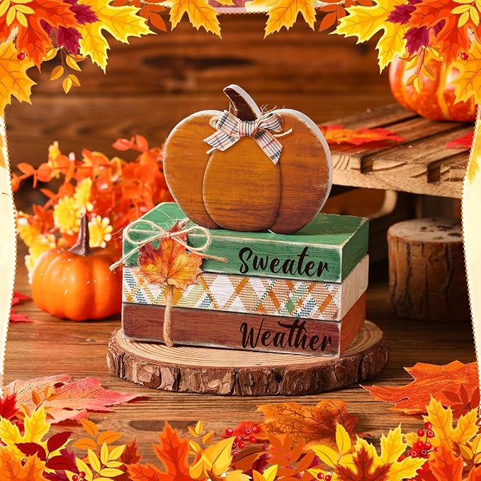 4 Pcs Fall Decorations for Home Fall Tiered Tray Decor Thanksgiving Wood Book Stack with Sign Autumn Stacked Book Decor Bundle for Office Table Shelf Decorative Trays(Pumpkin)