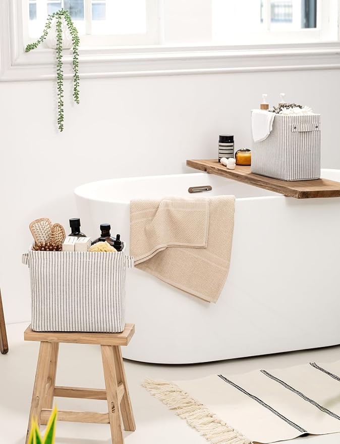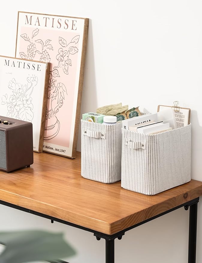 StorageWorks Narrow Storage Bins, Small Basket for Closet and Shelves, Rectangular Fabric Organizer with Handles, Toilet Paper Storage, Khaki and Beige Stripes, 2-Pack